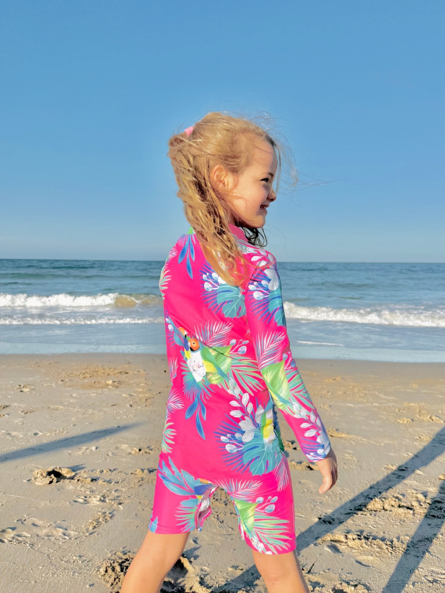 Practical, protective and oh-so-cute — our Finch Fiesta Neon Pink toddler UV suit is designed to keep little ones safe in the sun while making life easier for parents.