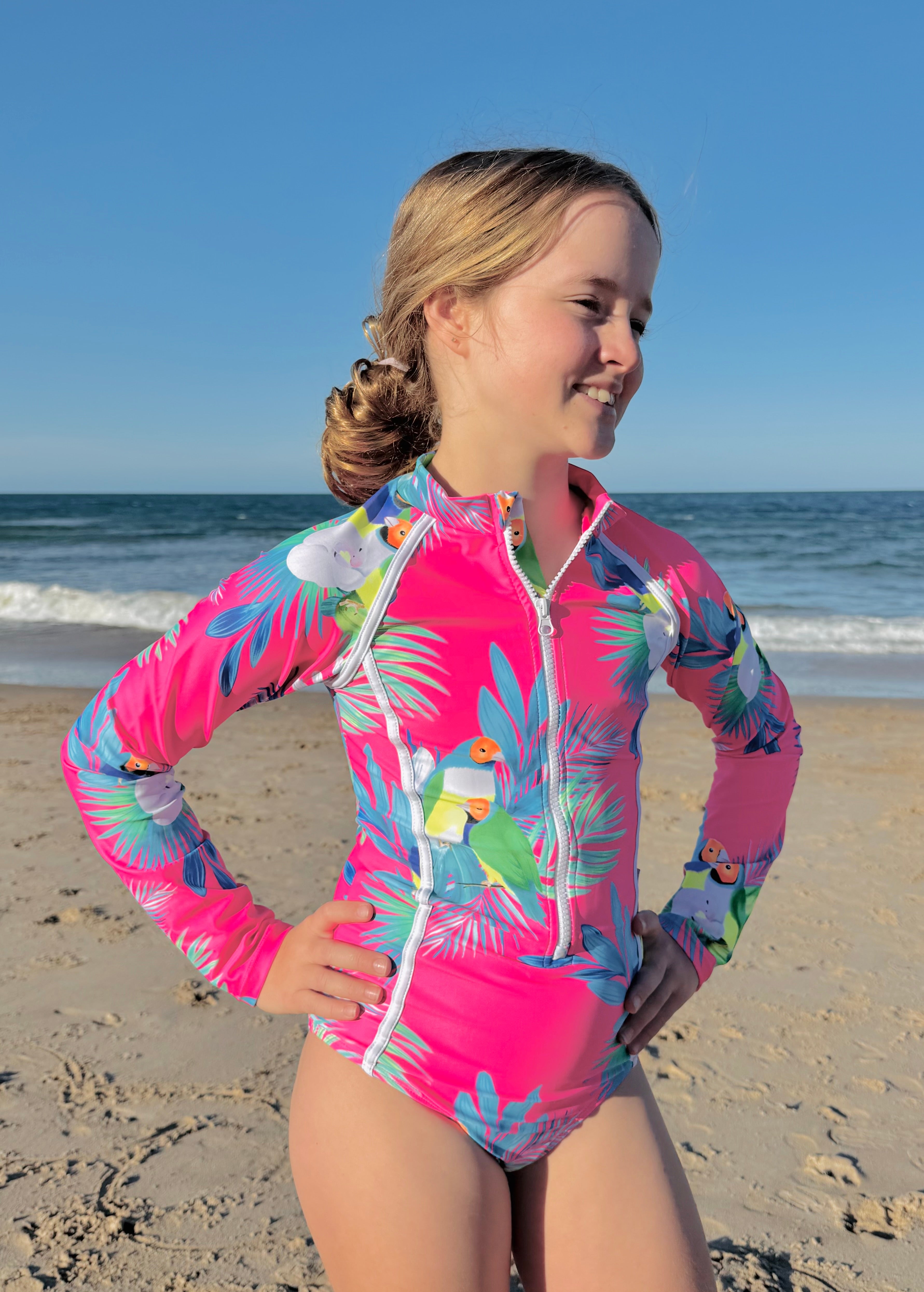 Teenage / Tween Girl Long-Sleeve Swimsuit - Finch Fiesta | Bright Pink