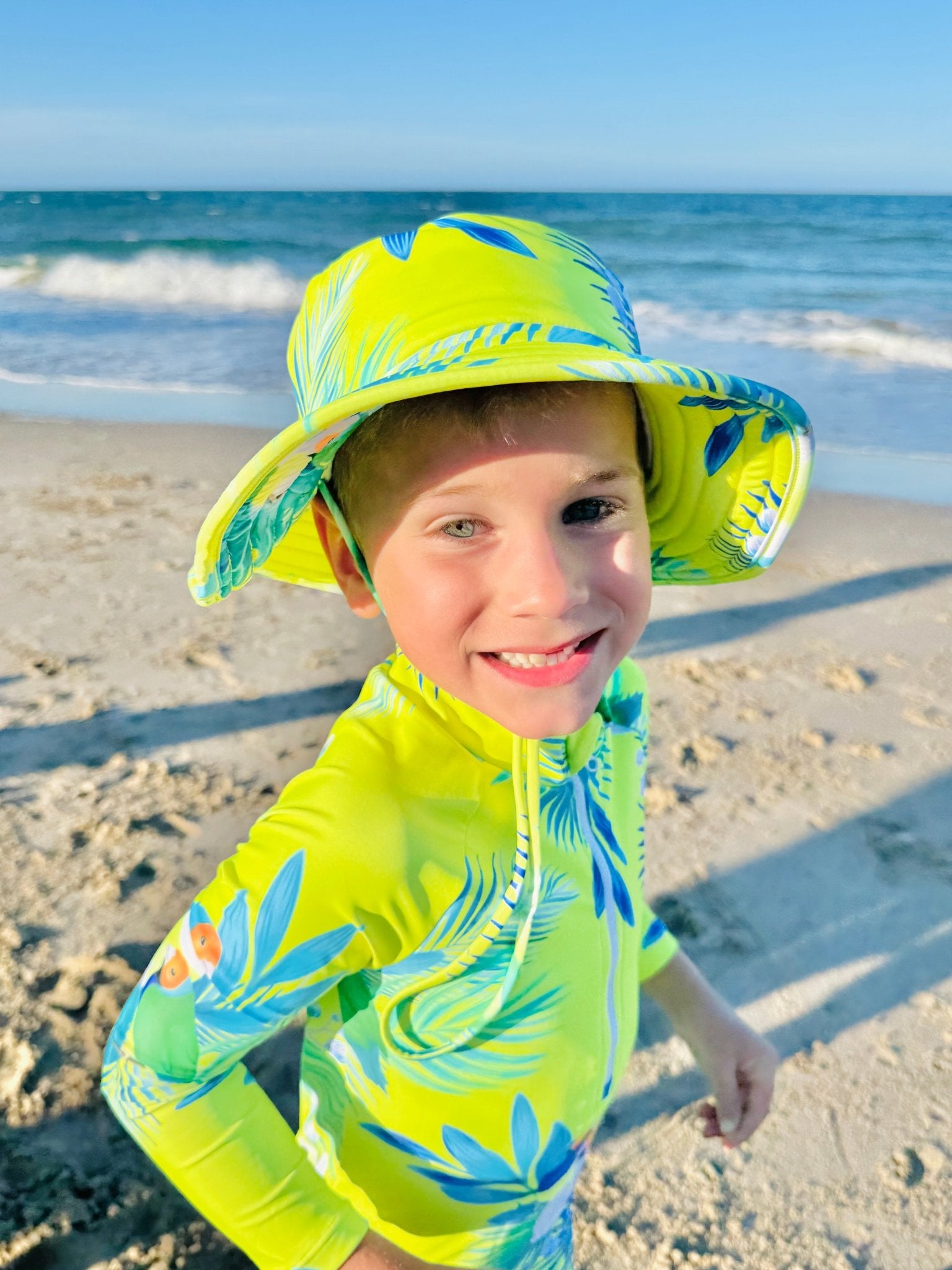 Bright, bold and practical, our Finch Fiesta Neon Yellow wide-brim sun hat is the ultimate accessory for safe, stylish play under the Australian sun. With its generous brim, this hat shields the scalp, ears, and face from harmful UV rays, making it perfect for the beach, pool, park or everyday adventures.