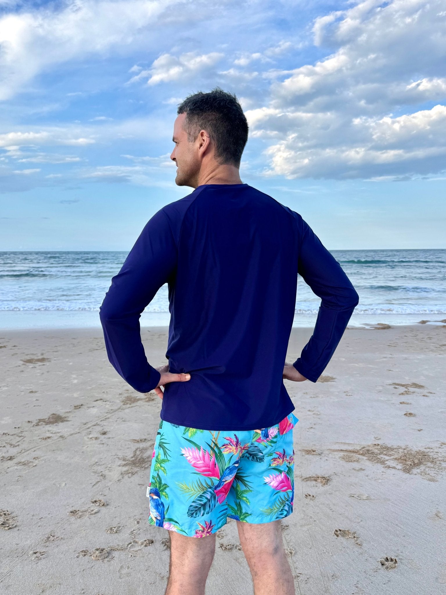 Our new Navy Blue Rash Guard Top for adults is perfect for long days in the sun, fishing trips or for fun in the surf.