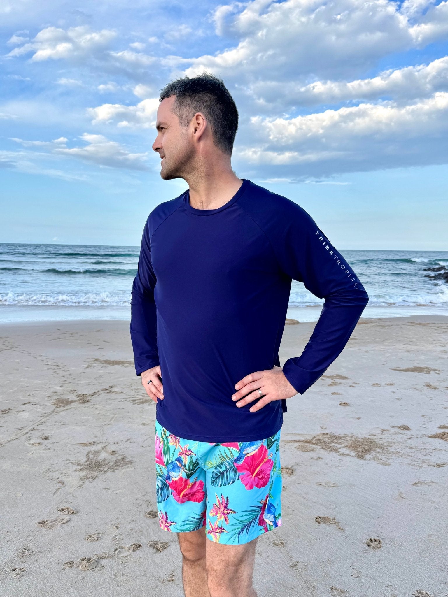 With minimal branding, and classic in design on timeless navy blue, this top features our Tribe Tropical logo on the upper left arm.